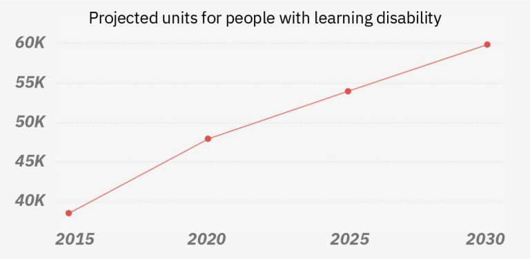Projected demand for supported housing in Great Britain 2015 to 2030 commissioned by the Department of Health (DH), on behalf of the Department of Communities and Local Government (DCLG), from the Policy Research Unit in Economics of Health and Social Care Systems (at the University of York, LSE and University of Kent), PSSRU Discussion Paper DP2931 (Mar 2017). Projected units of supported housing by client group in England, 2015-2030 (Base case, in thousand units).